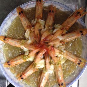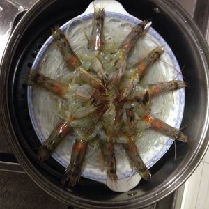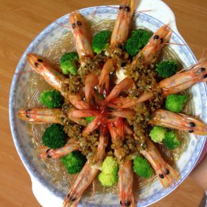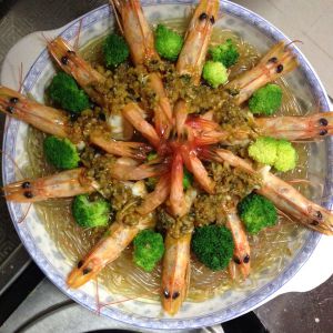 蒜蓉均匀的绕虾一圈,虾与虾之间放上汆熟的西兰花小瓣。