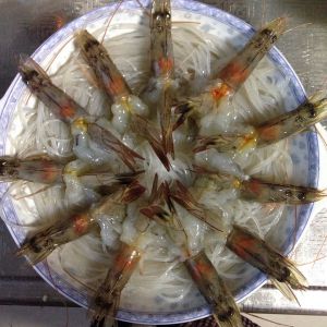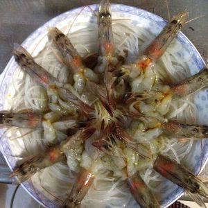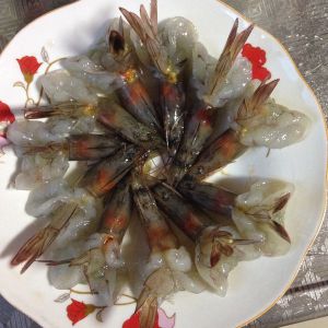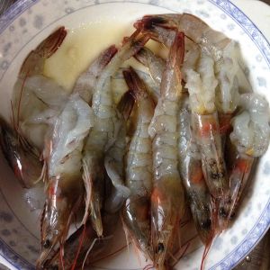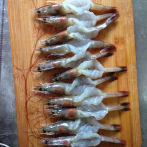 虾去除壳,留住末节虾壳和尾。去肠,开背