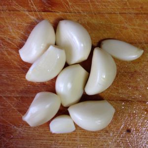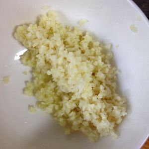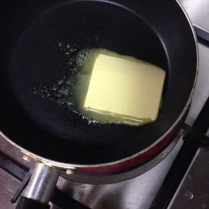蒸虾的时候做蒜蓉。不粘锅内放入黄油,烧化。如果没有黄油,用没有味道的色拉油。家里只有花生油了,怕影响蒜蓉的香味,所以用了黄油
