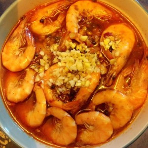 待虾变色后起锅,在表面放上少量姜蒜末,烧热油后淋在姜蒜末上。美味的香辣水煮虾待君品尝!