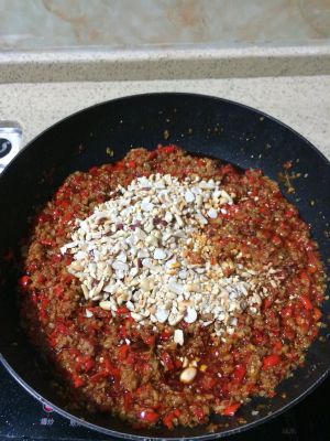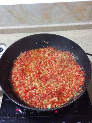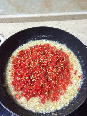 蒜蓉炒香的时候放入剁碎的小辣椒接着再炒。