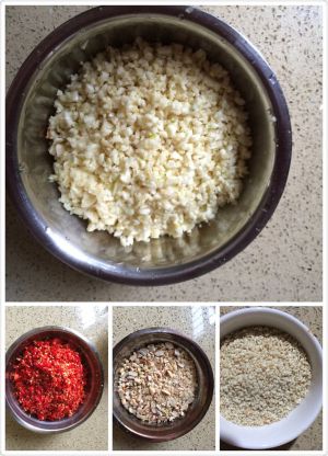 大蒜、小辣椒剁碎,准备好已经炒熟的花生碎以及芝麻。