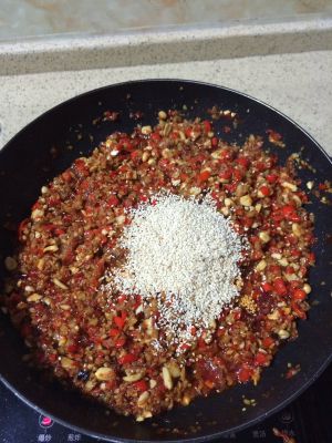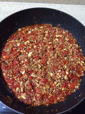 炒到小辣椒断生,有了一些炝味的时候放入辣酱、豆瓣酱以及适当的冰糖接着再炒。