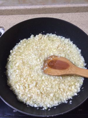 放入蒜蓉炒香,可能这段过程有点稍微长一些,既要炒香,又不能糊了,要用小火。