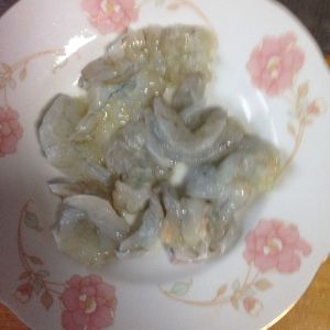 虾去头,剥去外壳。开背去除虾肠,就是黑黑的细长的东西。洗净