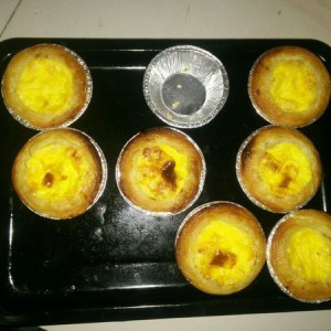 倒入蛋挞皮中2/3。可以加些水果丁。进烤箱。下火230,上火250,时间20分钟。
