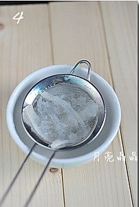 把泡发好的燕条放入过滤网内冲洗干净,如有细小的绒毛用镊子挑出