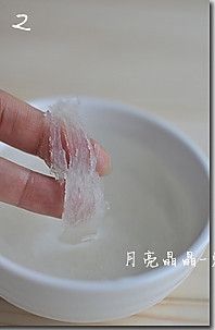 顺燕窝的纹理把燕条撕成细条放入炖盅,加纯净水,水量高过燕窝一指节。