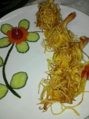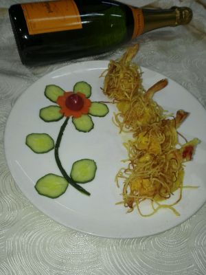 虾抹上备用的沙拉酱裹上土豆丝摆盘即可。