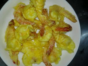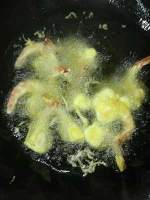 中火锅里加入适量油,烧至五成熟,备用虾裹糊下锅炸至金黄色捞出沥干油备用。