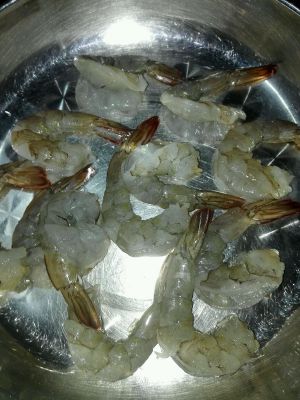 青虾去皮,去头,用牙签挑出虾线放少许油,料酒,胡椒粉腌制五分钟左右备用。