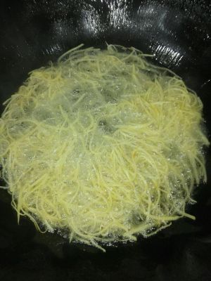 捞出炸后,大火烧至七成熟,土豆丝沥干水下锅炸至金黄色沥干油备用。
