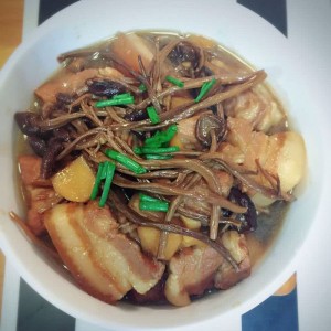出锅。撒上葱。。美味的茶树菇红烧肉就完成了。全程不用油。不油腻。超美味哦。