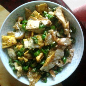 抄到差不多时,就把切好的蛋倒入,一起翻炒,加入盐和味精(也可以适当的加入鸡精),最后装盘,一道青椒炒蛋就做好了。