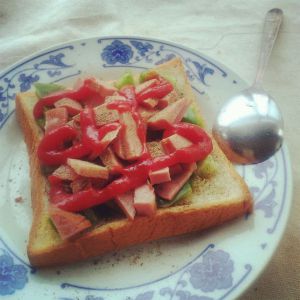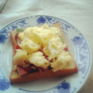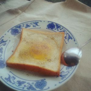 面包片用勺子把中间压平,磕一个鸡蛋,撒黑胡椒或者盐,记得把蛋黄挑破,不然在微波炉里容易爆