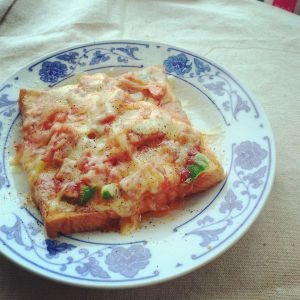 马苏里拉芝士碎铺满。我的芝士碎之前化了,现在掰不开了……囧