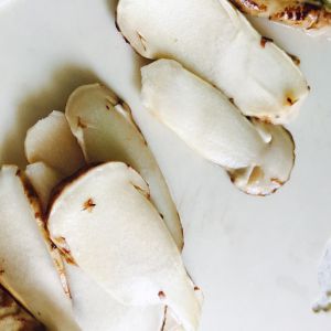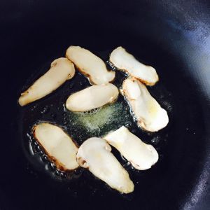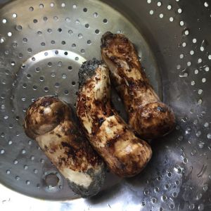 松茸解冻。可以放在常温下解冻,或者用开水浸泡2分钟,用手捏捏软了就可以了。去松茸根部,然后放到清水里浸泡5分钟,再冲洗干净。最好将表面黑色洗掉。