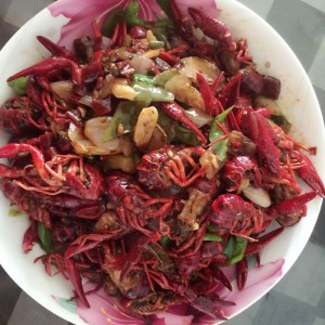 到3分1油,大火,加姜,蒜,二青条,青红花椒,干辣椒,炒香,(多翻炒),加洋葱,加豆瓣或火锅料,炒香,炒香后加小龙虾翻炒均匀。然后加半碗水,继续翻炒,加生抽调味,加白糖,鸡精。起锅前加青椒丝,葱段