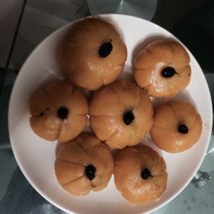 最后将糯米团,搓成长条,切下一个个小锍子,再搓成碗形放入调好的黑芝麻,收口,搓圆,用调羹画一个个南瓜印,最后用葡萄干做瓜藤。(由于手上都是糯米粉没法拍制作过程,大家多包含啊)