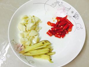 准备:姜丝,蒜瓣,泡椒。