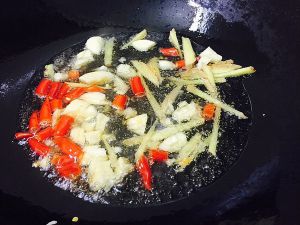 热锅下油,下入:姜丝,泡椒,蒜瓣