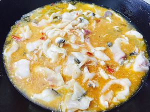 剩小量汤,在锅内继续加热至沸腾。将鱼片下进去。⚠️不要去搅!不要盖锅盖!沸腾煮熟就可。