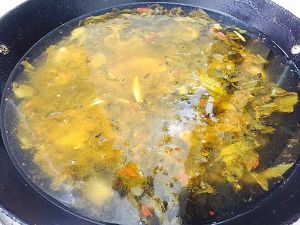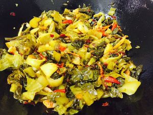 姜蒜爆出香味后,放入酸菜,翻炒