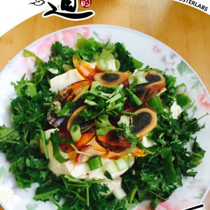 香菜切碎备用,摆在豆腐边缘,把松花蛋切成片状或切丁也可,把葱切成葱花放在松花蛋上面
