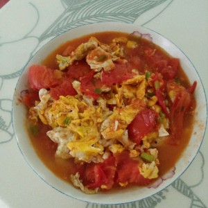 把鸡蛋倒进锅里,和西红柿拌一下,就可以吃了!!
