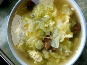 香菇泡开。切丝。苞菜切好洗净。鸡蛋放入碗中打匀