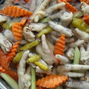 胡萝卜,芹菜切块,放入纯净水,野山椒,盐糖味精,白醋,调味后放入过凉的鸡爪,放进冰箱冷藏一夜就可以开动了哈。