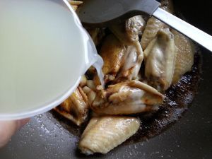 倒入鸡翅翻炒片刻后加入酱油和米酒。