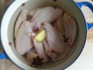 鸡翅清洗干净后放锅里加入清水和姜块花椒大料开锅后煮3-5分钟。做台式三杯鸡可以选择鸡翅鸡腿,或是整鸡。
