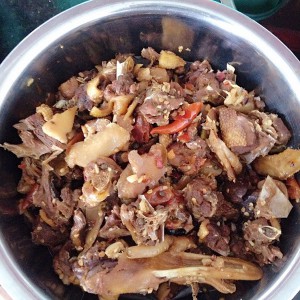 倒入鸭肉,一起翻炒