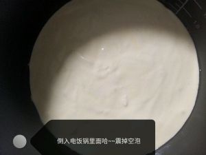将搅拌好的面糊倒入预热好的电饭锅里面,然后轻轻提起,离案台20厘米左右提起震出气泡