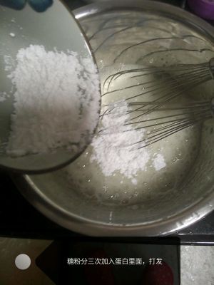 打发蛋白霜,将剩下的糖粉分三次加入打发蛋白