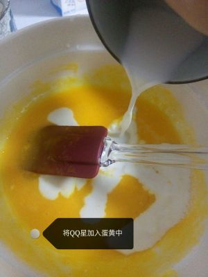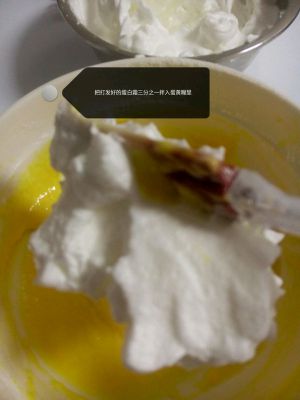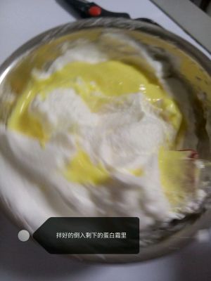 将三分之一的蛋白霜搅拌到蛋黄糊里面