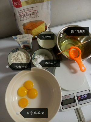 准备好材料,蛋黄蛋白分离。装材料的碗,需无油无水喔~~