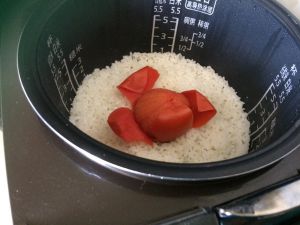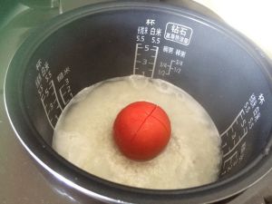 像平时那样洗米煮饭,水的量也和平时煮饭一样多,再将番茄倒扣在米中间,撒入盐调味,盖上电饭煲,按下煮饭键,煮简易版的一个番茄饭!