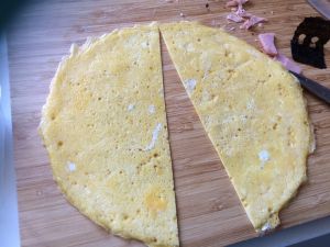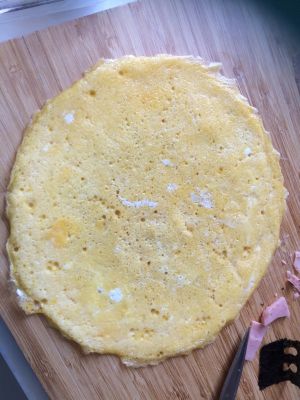 待鸡蛋边缘稍稍翘起,翻面摊10秒(我数十下),关火。取出圆鸡蛋皮。