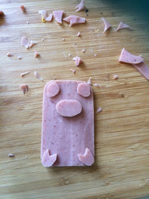 最后制作小猪:我还是使用双汇的方块火腿肠,切出长方形的身体,剪出小猪的鼻子耳朵和4只猪蹄!为了保持对称,我通常切两块薄火腿,重叠在一起剪!这样剪出来的东西是对称的。