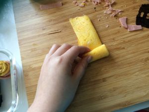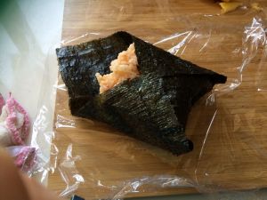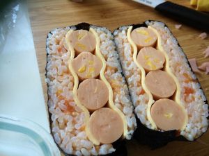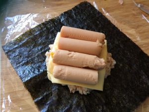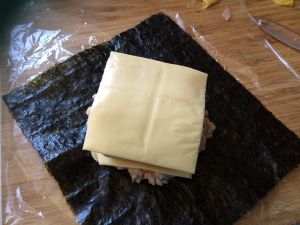盖上一片芝士片,注意芝士片的摆放和海苔是交错的菱形!