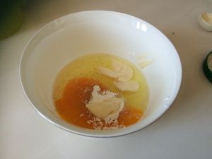 接着制作鸡蛋玫瑰花:将一个鸡蛋、盐、胡椒粉、10g沙拉酱、1/2茶匙玉米淀粉,混合均匀!