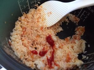 用饭铲将软烂的番茄和饭一起捣碎。再加入番茄沙司调味!番茄沙司的量可以自己把握,我用了2汤匙番茄沙司,感觉味道正好。
