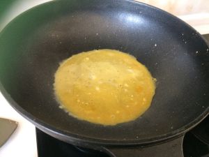 锅小火微热,在锅中央倒入鸡蛋液,迅速转动锅,使鸡蛋液呈圆形。(注意锅子千万不能太热,不然鸡蛋液倒入会飞快凝固,摊不出圆形!)