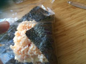 用保鲜膜将紫菜包饭压实!