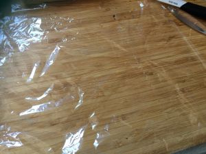 在砧板上铺上保鲜膜。
