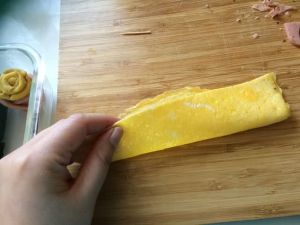 从长条鸡蛋的一端卷起!