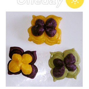 (用二分之一的面团做的双色四瓣尖角馒头,剩下的面团做的----彩虹发糕。)