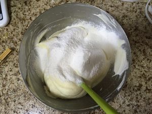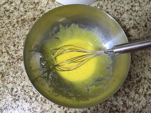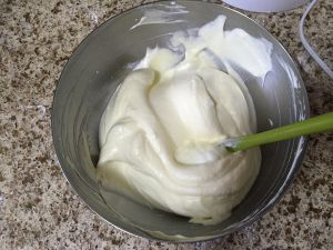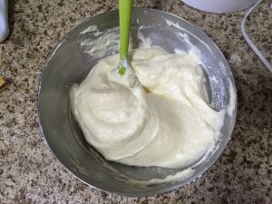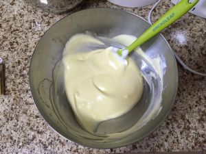 将蛋白霜分2-3次与蛋黄液翻拌混合均匀。